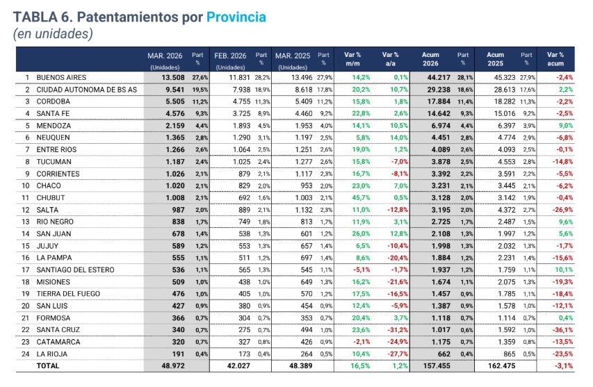 Acara informó que el número de vehículos patentados durante marzo de 2026 ascendió a 48.972 unidades, lo que representa un crecimiento del 1,2% interanual, ya que en marzo de 2025 se habían registrado 48.389 unidades. Si la comparación es contra febrero, se observa una suba del 16,5% ya que en ese pasado mes se habían registrado 42.027 unidades.